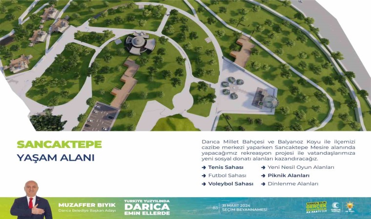 "Kentsel Cazibe Merkezleri" ve "Yeni Yaşam Alanları" başlığı altında Darıca’ya değer katacak projeler hazırladıklarını dile getiren Başkan Muzaffer Bıyık, "5 yıl boyunca ilçemize birçok eser ve hizmet kazandırdık. Aynı kararlılıkla canla başla çalışarak Darıca’mızın cazibesine değer katacak marka değerini artıracak yeni projeleri yeni dönemde hayata geçireceğiz. Millet Bahçesi ve Balyanoz Koyu’ndaki çalışmalarımızın yanı sıra Sancaktepe Yaşam Alanı Projesi ile Darıca’mızın nefes aşacağı bir merkezi daha hayata geçireceğiz. Tenis sahaları, futbol, voleybol ve basketbol sahaları, piknik alanları, dinlenme alanları ve yeni nesil oyun alanları ile Sancaktepe’yi gerçek anlamda bir yaşam alanına dönüştüreceğiz. Sancaktepe’ye yeni bir ulaşım aksı da açarak ulaşımı daha kolay hale getireceğiz" dedi.