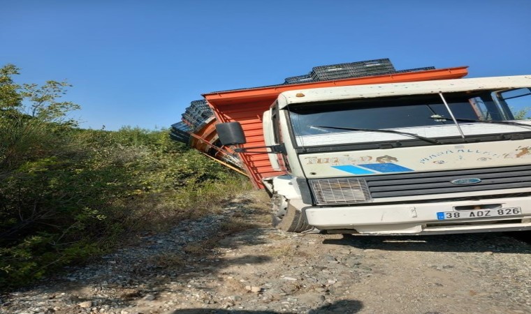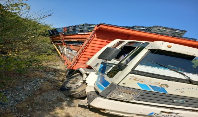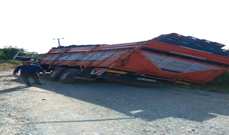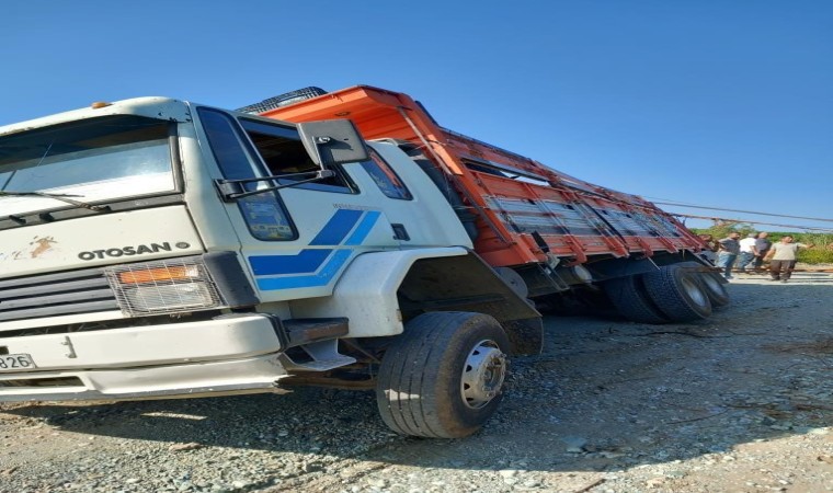 Hatay’ın Dörtyol ilçesinde narenciye yüklü kamyon, bozuk yoldaki yarığın içine düştü.