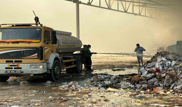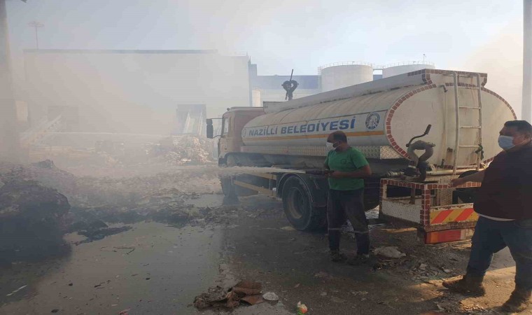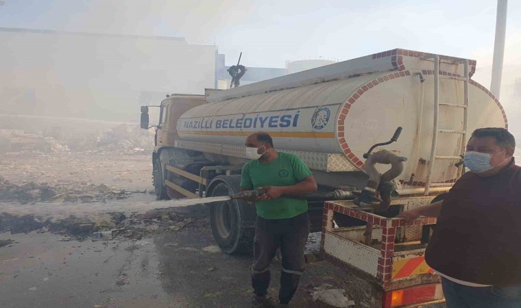 Aydın’ın Söke ilçesindeki kağıt fabrikasında çıkan yangın, karadan ve havadan müdahaleyle kontrol altına alınmaya çalışılırken Nazilli Belediyesi de söndürme çalışmalarına destek veriyor.