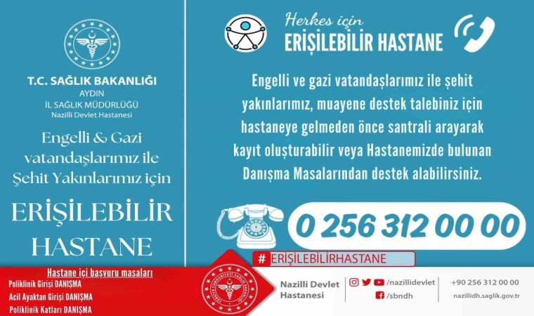 Nazilli Devlet Hastanesi Başhekimi Uzm. Dr. Necati Akkaya, yaptığı bilgilendirmede, “Engelli ve gazi vatandaşlarımız ile şehit yakınlarımız için hastanemizde yeni bir proje hayata geçiriliyor. ‘Herkes İçin Erişilebilir Hastane’ projemizle; engelli ve gazi vatandaşlarımız ile şehit yakınlarımız, hastanemize geldiklerinde bulundukları yerden destek ihtiyaçlarını bildirebilecekler. Arama yapmadan destek almak için; poliklinik girişi ve acil ayaktan girişi başta olmak üzere poliklinik katlarımızda bulunan danışma masalarımıza başvurabileceklerdir” dedi.