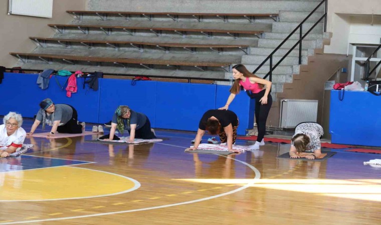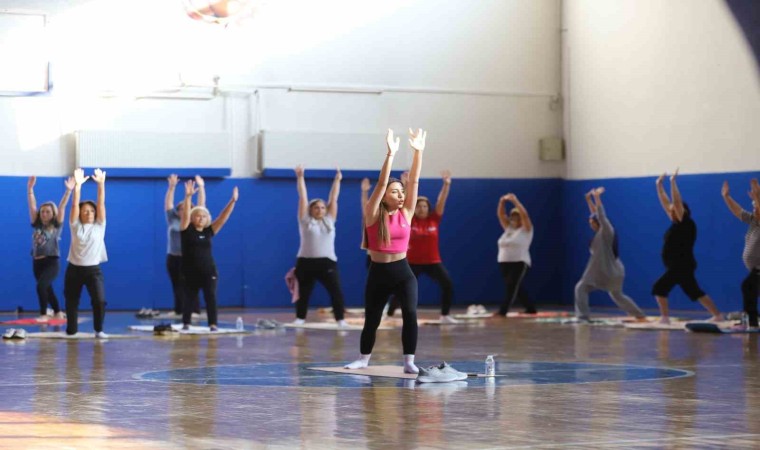 Nazilli Kapalı Spor Salonu’nda yoga eğitmeni rehberliğinde yapılan çalışmalar, katılımcılara hem zihinsel hem de fiziksel farkındalık sağlıyor. Kadınlara özel ücretsiz olarak düzenlenen eğitimde, katılımcılar çeşitli yoga pozlarıyla vücutlarını esnetirken aynı zamanda stres atıyor. Yaklaşık 60 kişinin katıldığı kursta; esneklik, denge, nefes teknikleri üzerine çalışmalar yapıldı.