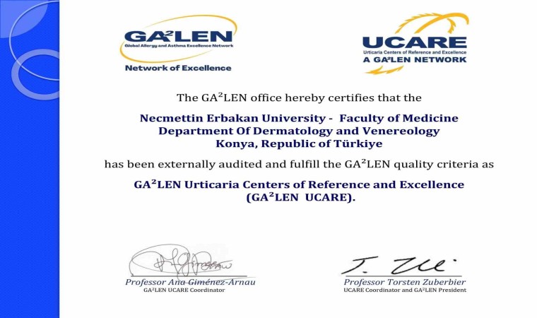 Necmettin Erbakan Üniversitesi (NEÜ) Tıp Fakültesi Deri ve Zührevi Hastalıkları Ana Bilim Dalı, dünya çapında ürtiker hastalarının teşhis ve tedavisinde mükemmeliyet standardı sunan, 44 ülkeden yaklaşık 170 merkezin yer aldığı UCARE (Ürtiker Referans ve Mükemmeliyet Merkezi-Urticaria Centers of Reference and Excellence) ağına kabul edildi.