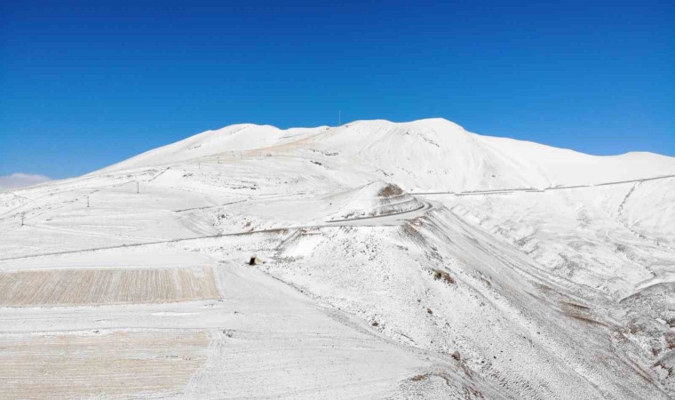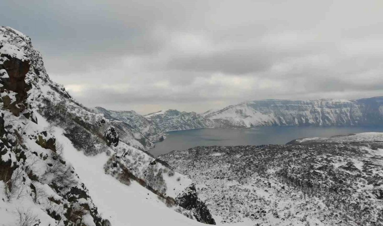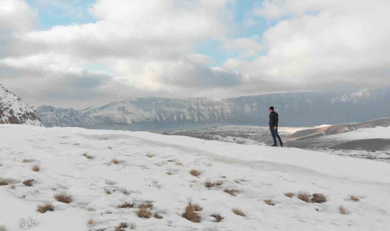 Bitlis’in Tatvan ilçesinde yer alan ve zirvesinde Dünya’nın ikinci büyük krater gölü bulunan Nemrut Kalderası yağan karla beyaz gelinliğini giydi.