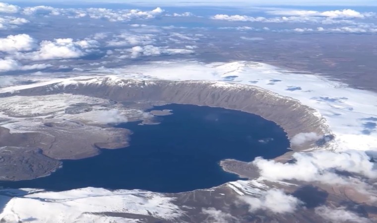 Bitlis’in Tatvan ilçesinde bulunan dünyanın ikinci büyük krateri olma özelliğine sahip Nemrut Krater Gölü’nün karla kaplı güzelliği havadan görüntülendi.