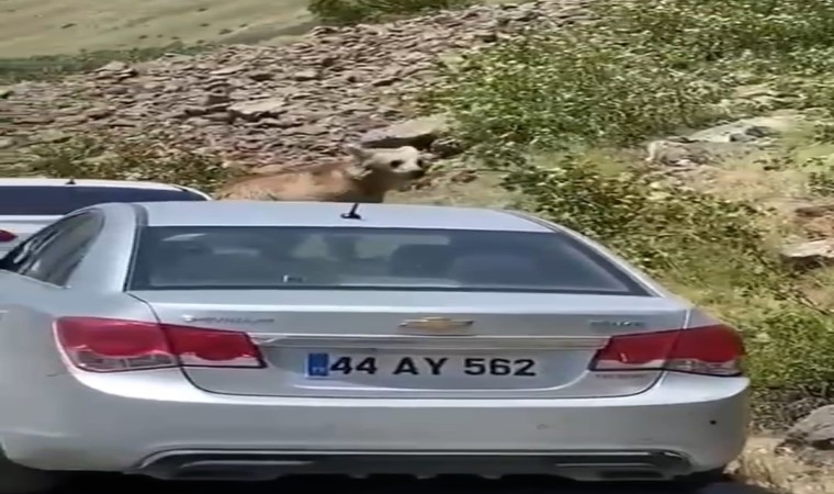 Bitlis’in Tatvan ilçesinde bulunan Nemrut Krater Gölü’nü ziyaret giden vatandaşların arabalarının önünü kesen ayı arabanın üstüne çıktı.