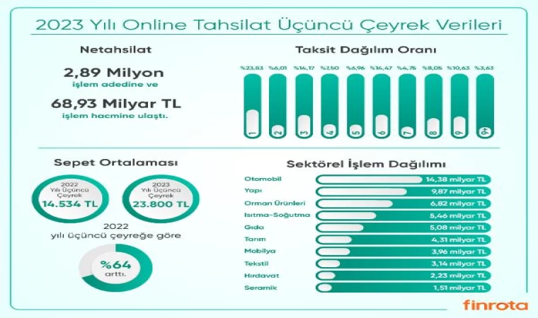 2023 yılının üçüncü çeyreğinde Netahsilat üzerinden en çok tahsilat alınan sektör otomotiv oldu. Otomotiv sektörünün tahsilat hacmi, bir önceki yılın aynı dönemine göre yüzde 97 artarak 14,38 milyar liraya yükseldi. Yüzde 93 artışla 9,87 milyar lira işlem hacmine sahip olan yapı sektörü ikinci sırada, yüzde 84 artışla 6,82 milyar lira hacme yükselen orman ürünleri sektörü ise üçüncü sırada yer aldı. Ayrıca 2023'ün temmuz, ağustos ve eylül aylarında yapılan tahsilatların yüzde 76,17'si taksitli, yüzde 23,83'ü ise tek çekim olarak gerçekleşti.