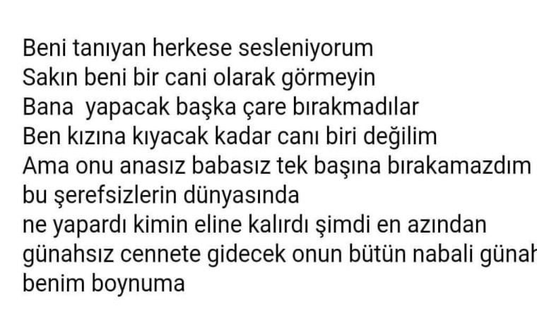 Y.T. olayın ardından sosyal medya hesabında; "Beni tanıyan herkese sesleniyorum. Sakın beni bir cani olarak görmeyin. Bana yapacak başka bir çare bırakmadılar. Ben kızına kıyacak kadar cani biri değilim. Ama onu anasız, babasız tek başına bırakamazdım bu ... dünyasında. Ne yapardı, kimin eline kalırdı? Şimdi en azından günahsız cennete gidecek. Onun bütün vebali, günahı benim boynuma" paylaşımında bulundu.