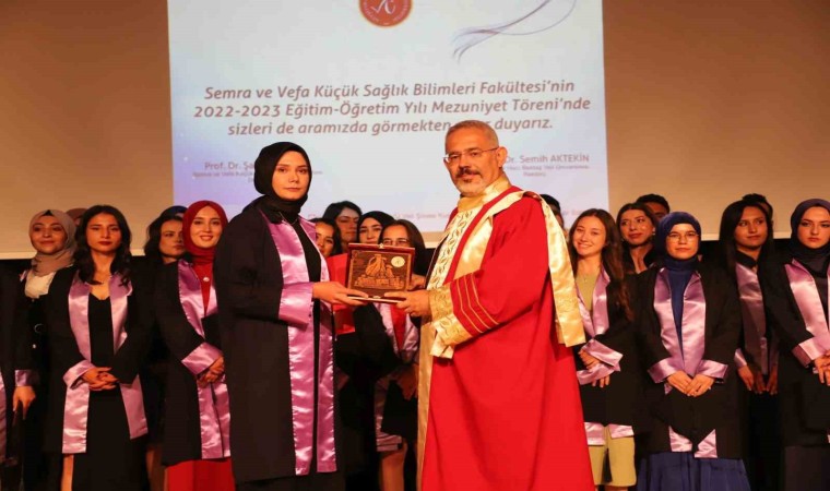 Mezuniyet töreni, 2022-2023 Eğitim-Öğretim Yılı'nda Semra ve Vefa Küçük Sağlık Bilimleri Fakültesi'ni birincilikle tamamlayan öğrencilerden Mahmut Yılmaz'ın, mezuniyet yaş kütüğüne çaktığı plaka ile heyecan, gurur ve mutluluğunu taçlandırmasının ardından devam etti.