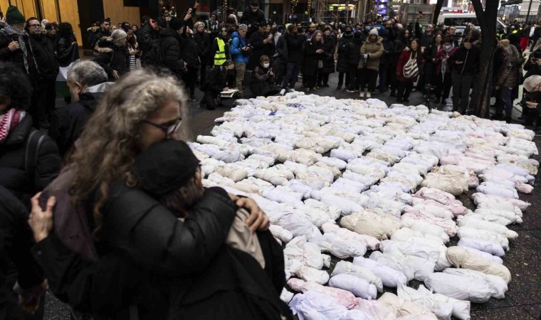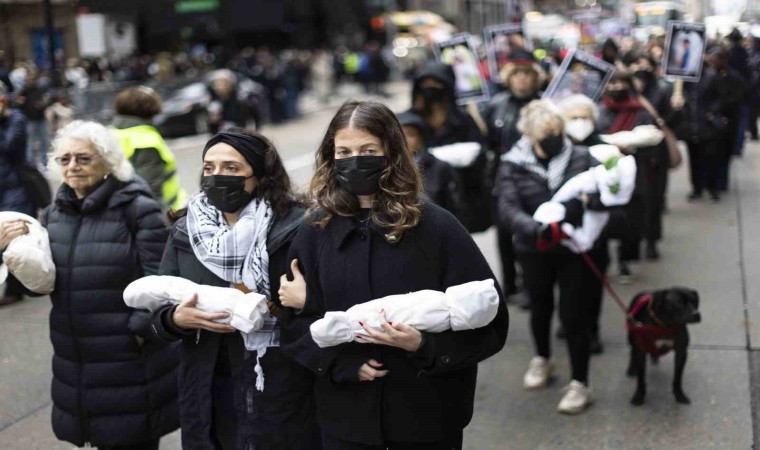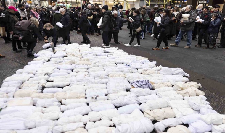 ABD’nin New York kentinde ateşkes talebiyle sokaklara dökülen yüzlerce gösterici, Gazzeli çocukları temsil eden kefenli maketlerle yürüyüş düzenledi.