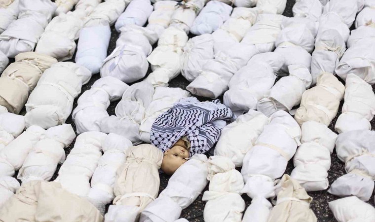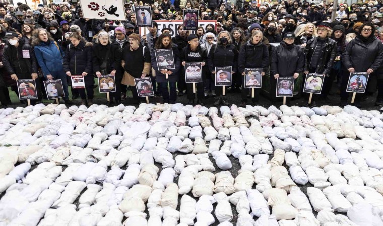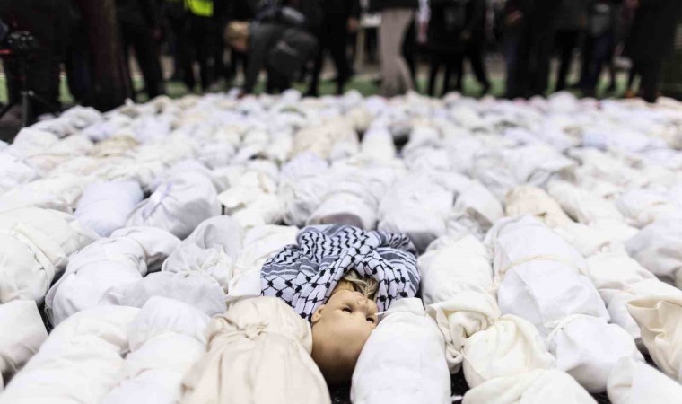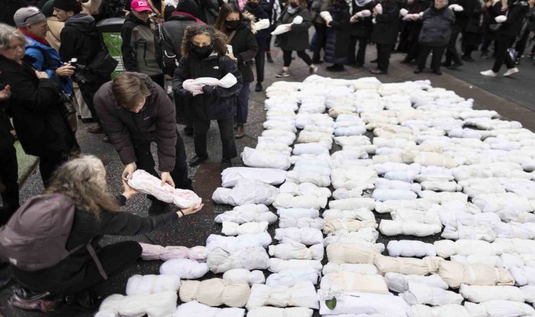 İsrail’in havadan, karadan ve denizden abluka alarak Gazze Şeridi’ne gerçekleştirdiği saldırılara dünya kamuoyunun tepkisi sürüyor. ABD’nin New York kentinde yüzlerce kişi, İsrail’in Gazze Şeridi’ne yönelik devam eden ağır bombardımanına tepki göstermek için sokaklara döküldü. Manhattan bölgesindeki Bryant Parkı’nda toplanan göstericiler, ellerinde İsrail’in saldırılarında ölen Gazzeli çocukları temsil eden kefene sarılı maketlerle ünlü Times Meydanı’na doğru yürüdü. Gazze’de derhal ateşkes ilan edilmesi çağrısında bulunan göstericiler, kefene sarılı 500 bebek maketini caddeye bıraktı.