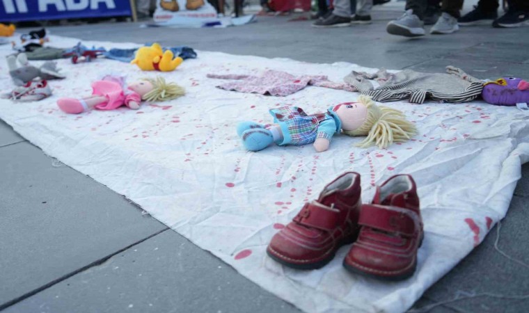 "Yaşasın nehirden denize özgür Filistin", "Kahrolsun İsrail" ve "Kahrolsun soykırımcı emperyalizm" sloganları atan grup, üzerinde İsrail Başbakanı Binyamin Netanyahu’nun fotoğrafının olduğu tabutu ateşe verdi ve meydana oyuncak bıraktı.