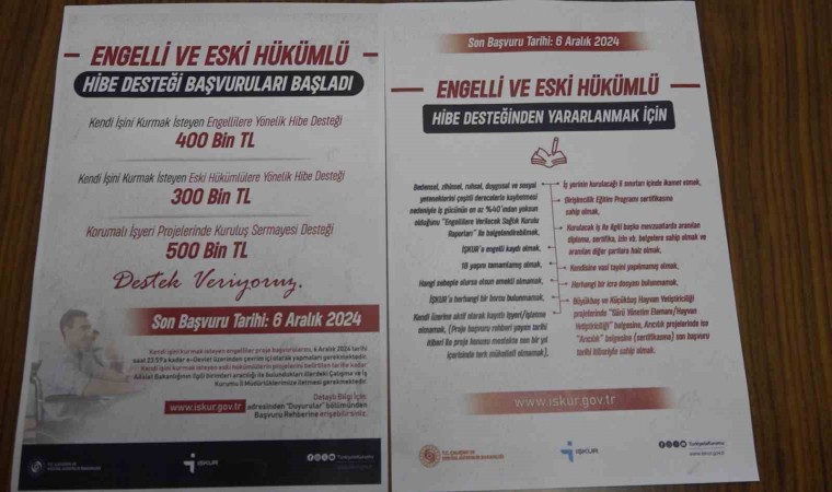 Projeleri kabul edilen engelli girişimcilere 400 bin, eski hükümlülere ise 300 bin lira hibe desteği verileceğini aktaran İŞKUR İl Müdürü Ali Bingül, korumalı iş yeri projelerinde de 500 bin lira kuruluş sermayesi desteği sağlanacağını ifade etti. Bingül, "İŞKUR olarak ilimizde kendi işini kurmak isteyen engelli ve eski hükümlü vatandaşlarımızın projelerini önemsiyor, daha fazla sayıda engelli ve eski hükümlü vatandaşlarımızın kendi işini kurma hibe desteğine başvuru yapmasını istiyoruz. İŞKUR, engelliler ile eski hükümlüleri kendi işini kurmaları yönünde hibe projeleriyle desteklemeye devam etmektedir. Kendi işini kurmak isteyen engelli girişimcilere 400 bin TL hibe desteği, kendi işini kurmak isteyen eski hükümlü girişimcilere 300 bin TL hibe desteği başvuruları devam ediyor. Bu destek, korumalı iş yeri projelerinde 500 bin TL kuruluş sermayesi desteğine kadar varabiliyor" diye konuştu.
