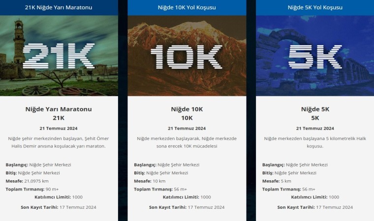 Gençlik ve Spor Bakanlığı, Niğde Valiliği, Niğde Belediyesi ve Türkiye Atletizm Federasyonu işbirliğinde ’Tarih, Doğa ve Kültür Yolunda Koşun’ sloganı ile Şehit Ömer Halisdemir anısına Niğde Yarı Maratonu gerçekleşecek. Şehir merkezinde gerçekleşecek olan yol koşusu yarışının 21 kilometre mesafesi 21 Temmuz 2024 tarihinde saat 08:00’de, 10 kilometre mesafesi saat 09:00’da 5 kilometre halk koşusu ise 09:15’te start alacak. Katılımcıların yarı maraton mesafesini kısmi yeterlilik esasına göre, 3 saat 30 dakika, 10K mesafesini 1 saat 30 dakika içerisinde tamamlamaları gerekecek. Kısmi yeterlilik, katılımcıların karşılaşabilecekleri doğa şartlarında güvenli bir şekilde devam etmelerine imkan sağlayacak malzemeleri yanlarında taşımaları anlamına geliyor. 18 yaşın üzerindeki herkesin katılımına açık olan koşuda 16-18 yaş grubu ise ebeveyn izni ile sadece 5K ve 10K yarışına katılabilecek. Katılımcıların 21 Temmuz 2024 tarihinde geçerli ve koşmalarına engel olmadığını belirten yarışma tarihinden önceki bir yıl içerisinde alınmış bir sağlık belgesine veya Atletizm, Triatlon, Dağcılık, Oryantiring veya Bisiklet Federasyonlarından onaylı sporcu lisansına sahip olmaları gerekiyor. Sadece kayıtlı koşucuların katılabileceği maratonda kayıtlar www.nigdeyarimaratonu.com internet sitesi üzerinden gerçekleştirilecek. Kayıt olmak isteyenler için son kayıt tarihi ise 17 Temmuz 2024 saat 17:00 olarak açıkladı. Katılımcı sayısının bin kişi ile sınırlandırıldığı maratonda kayıtlar bu limite ulaşıldığında son kayıt tarihi beklenmeden kapatılacağı bildirildi. 21K Niğde Yarı Maratonu katılım ücreti ise 510 TL, 10K Niğde Yol Koşusu 410 TL, 5K Halk Koşusu ise 100 TL olarak açıklandı. Niğde Yarı Maratonu’nda Genel Klasman Erkek ve Kadın birincilerine 5 bin TL, Genel Klasman Erkek ve Kadın İkincilerine 3 bin TL, Genel Klasman Erkek ve Kadın Üçüncülerine ise 2 bin TL nakdi ödül verilecek. Koşuyu zaman limitinde ve kurallar dahilinde bitirmiş olan her katılımcıya bitiren madalyası hediye edilecek.