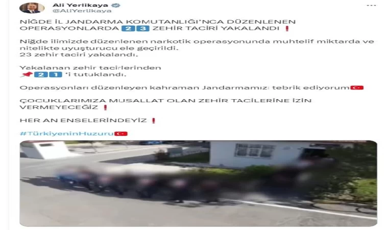 ANKARA, (DHA)- İÇİŞLERİ Bakanı Ali Yerlikaya, Niğde'de düzenlenen uyuşturucu operasyonunda 23 şüphelinin yakalandığını duyurdu.