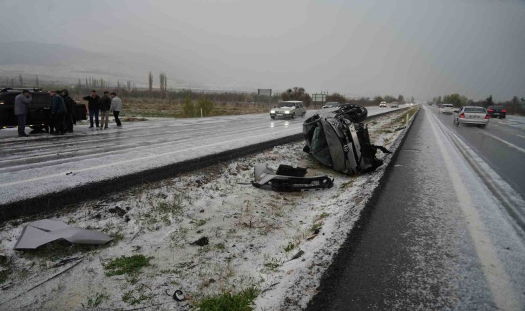 Niğde-Kayseri yolunda etkili olan dolu ve sağanak nedeniyle kayganlaşan yolda 4 araç birbirine girdi. Kazada 2’si çocuk 8 kişi yaralandı.