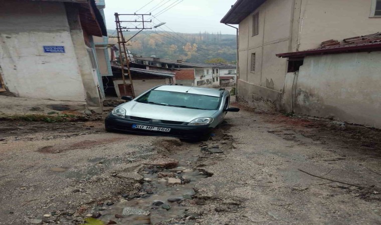 Tokat’ın Niksar ilçesinde 3 yıl arayla aynı noktada yine yol çöktü, araç yola saplandı.