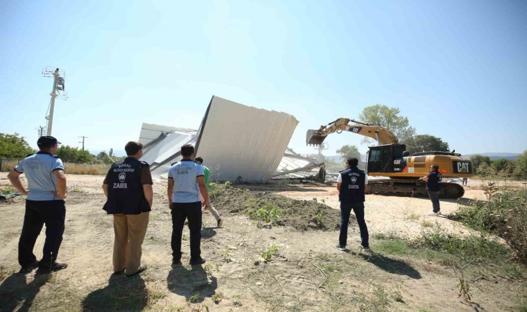 Tarım arazisi üzerine ruhsatsız inşa edildiği tespit edilen iki yapı yerle bir edildi. Ürünlü Mahallesi’nde 400 metrekarelik, Tahtalı Mahallesi’nde de 900 metrekarelik iki yapı, iş makinesinin darbeleriyle yıkıldı.