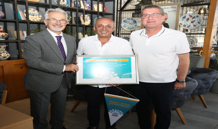 ‘Örnek İş Yeri’ belgesini, programa katılan Bozcaada Belediye Başkanı Dr. Hakan Can Yılmaz ile birlikte işletmeci Özcan Dilekyiğit’e veren Başkan Erdem, firma çalışanlarını da kutladı.