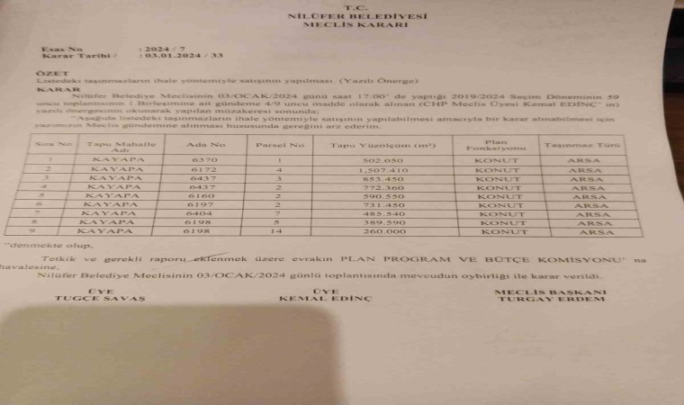 CHP Nilüfer Belediye Meclis Üyesi Kemal Edinç’in Ocak ayı olağan meclis toplantısında verdiği önergede, Nilüfer Belediyesi’ne ait bazı taşınmazların ihale usulü satılması gündem oldu. Önergeye sert tepki gösteren MHP Nilüfer İlçe Başkanı Levent Karakoç yaptığı yazılı açıklamada “Satmayın yeter, bu acele niye?” ifadelerini kullandı.