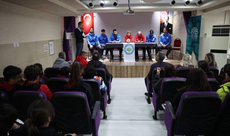 Nilüfer ve Bursa’yı THF Erkekler Hentbol Süper Lig’inde temsil eden Nilüfer Belediyespor Erkek Hentbol Takımı sporcuları ve teknik heyeti Vahide Aktuğ Ortaokulu’na konuk oldu. 130 öğrenciyle bir arayan gelen sporcular sportif kariyer ve gelişimleriyle ilgili açıklamalarda bulundu. Baş antrenör İlknur Kurtuluş, yardımcı antrenör Selim Muti, oyunculardan kaptan Gökhan Şanlı, Aleksander, Batuhan, Ömer ve Mücahit, başarılı sporcu