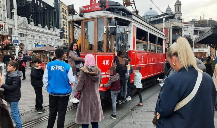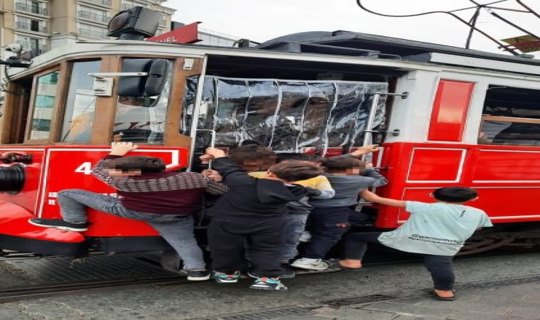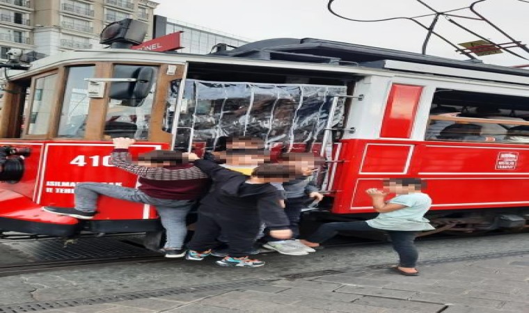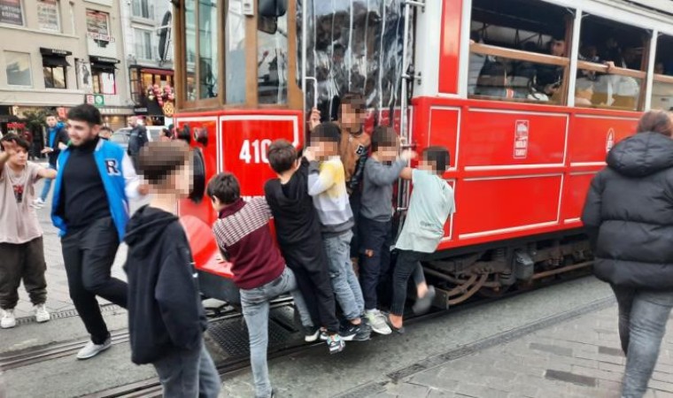 Beyoğlu İstiklal Caddesi’nde nostaljik tramvayın arkasına tutunarak ilerleyen bir grup çocuğun tehlikeli yolculuğu görenlerin yüreklerini ağzına getirdi. Çocukların canlarını hiçe saydığı anlar cep telefonu kamerasına yansıdı.