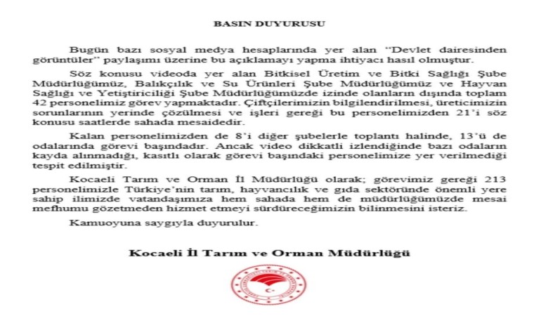 Görüntüler kısa sürede sosyal medyada yayılırken konuya ilişkin Kocaeli İl Tarım ve Orman Müdürlüğü yaptığı açıklamada "Bugün bazı sosyal medya hesaplarında yer alan, ’Devlet dairesinden görüntüler’ paylaşımı üzerine bu açıklamayı yapma ihtiyacı hasıl olmuştur. Söz konusu videoda yer alan Bitkisel Üretim ve Bitki Sağlığı Şube Müdürlüğümüz, Balıkçılık ve Su Ürünleri Şube Müdürlüğümüz ve Hayvan Sağlığı ve Yetiştiriciliği Şube Müdürlüğümüzde izinde olanların dışında toplam 42 personelimiz görev yapmaktadır. Çiftçilerimizin bilgilendirilmesi, üreticimizin sorunlarının yerinde çözülmesi ve işleri gereği bu personelimizden 21’i söz konusu saatlerde sahada mesaidedir. Kalan personelimizden de 8’i diğer şubelerle toplantı halinde, 13’ü de odalarında görevi başındadır. Ancak video dikkatli izlendiğinde bazı odaların kayda alınmadığı, kasıtlı olarak görevi başındaki personelimize yer verilmediği tespit edilmiştir. Kocaeli Tarım ve Orman İl Müdürlüğü olarak; görevimiz gereği 213 personelimizle Türkiye’nin tarım, hayvancılık ve gıda sektöründe önemli yere sahip ilimizde vatandaşımıza hem sahada hem de müdürlüğümüzde mesai mefhumu gözetmeden hizmet etmeyi sürdüreceğimizin bilinmesini isteriz" denildi.