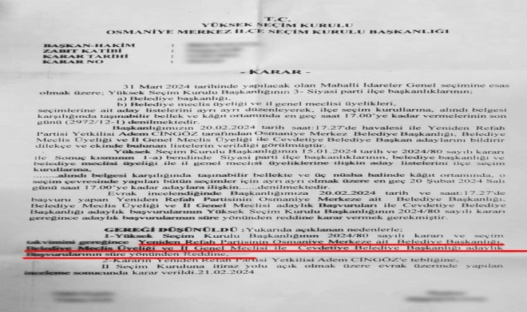 Yeniden Refah Partisi’nin Osmaniye Merkez Belediye Başkanlığı, Belediye Meclis Üyeliği ve İl Genel Meclisi ile Cevdetiye Belediye Başkanlığı adaylık başvurularının, seçim takvimine uyulmaması sebebiyle reddedildiği belirtildi. Kararda ayrıca, YSK’nın daha önce aldığı kararlar ve seçim takvimi gereği başvuruların süre yönünden reddine hükmedildiği ifade edildi.