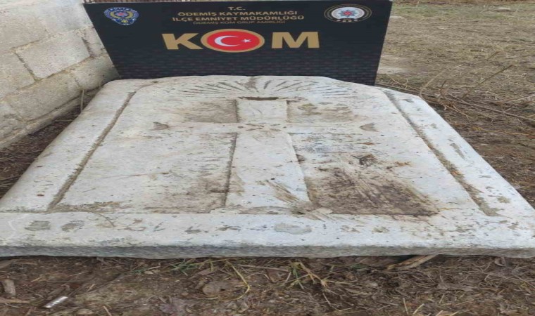 Ödemiş ilçesinde kaçak kazıda ortaya çıkarılan Bizans döneminden üzerinde hac işareti bulunan kilise levhası ve çeşitli mezar taşı parçaları ele geçirildi, konuyla ilgili 3 kişi gözaltına alındı.