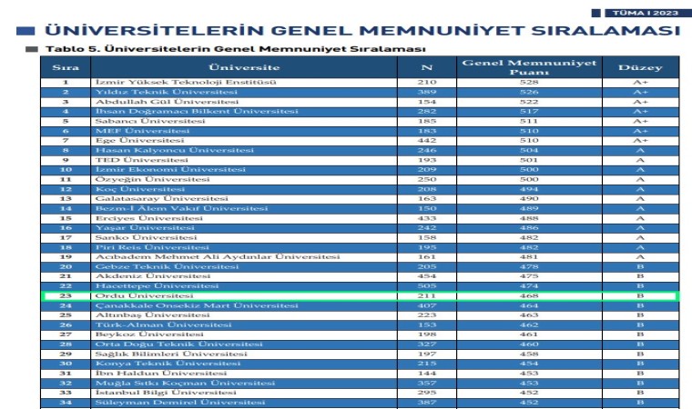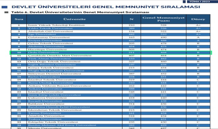 Lisans öğrencilerinin memnuniyet düzeylerinin ölçüldüğü Türkiye Üniversite Memnuniyet Araştırması (TÜMA) 2023 Raporu sonuçlarına göre Ordu Üniversitesi (ODÜ), 126 devlet üniversitesi arasında ilk 10’da yer alırken, Karadeniz Bölgesi’nde bulunan üniversiteler arasında 1’inci sırada yer aldı.