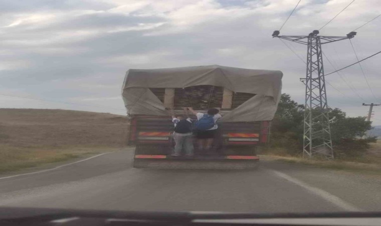Kastamonu’nun Tosya ilçesi Kösen köyü yolunda seyir halindeki odun yüklü kamyonun arkasına asılan 2 çocuk, kilometrelerce tehlikeli şekilde yolculuk etti. Yolda seyir halinde olan diğer sürücüler ise o anları cep telefonu ile görüntüledi. Cep telefonu kameralarına yansıyan görüntülerde, çocukların kamyonun arkasındaki kapağa tutunduğu görülüyor.