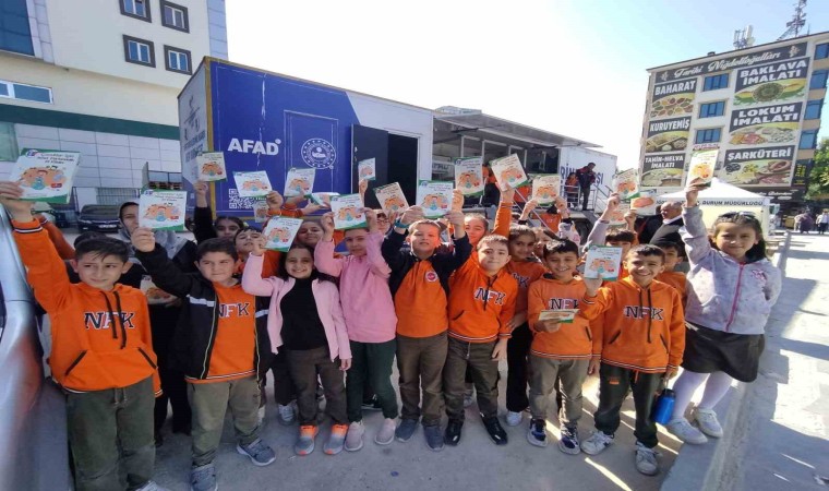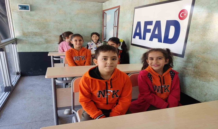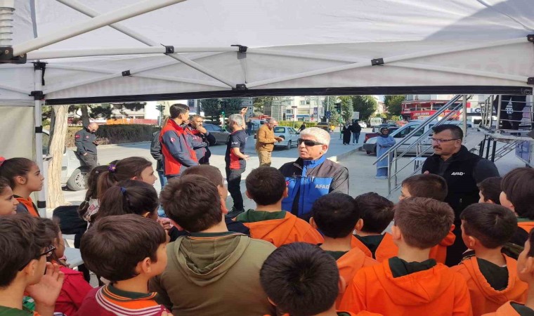 Öğrencilere, simülasyon aracına alınmadan önce meydana gelecek bir deprem anında yapması gerekenlerin anlatıldığı eğitimde, alınması gereken tedbirler, afet çantası gibi bilgilendirmeler yapılıyor.