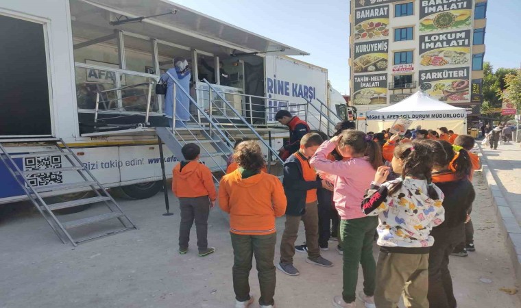 Deprem öncesi, sırası ve sonrasında yapılacak doğru davranışları anlatmak ve afet bilincini geliştirmek için Niğde’ye gelen Mobil Deprem Simülasyon Aracında uygulamalı eğitim veriliyor.