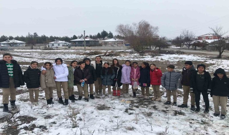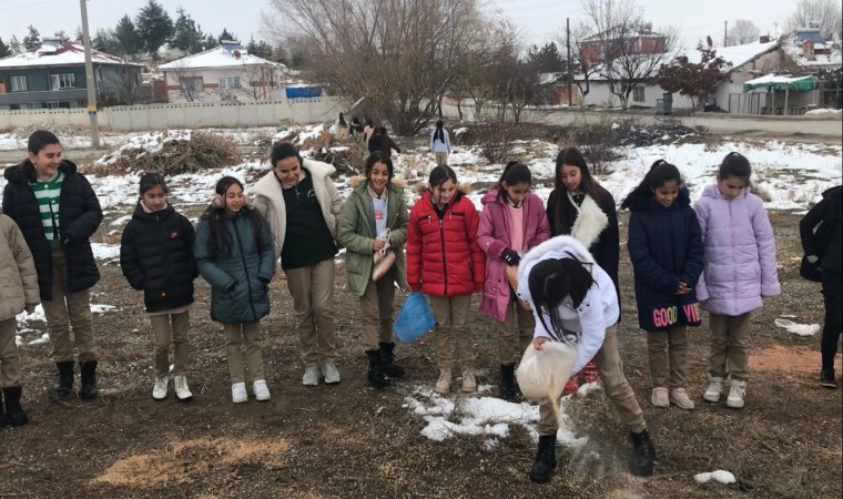 Çorum’da ortaokul öğrencileri, soğuk hava ve kar yağışı sebebiyle yiyeyecek bulunamayan hayvanlar için doğaya yiyecek ve su bıraktı.