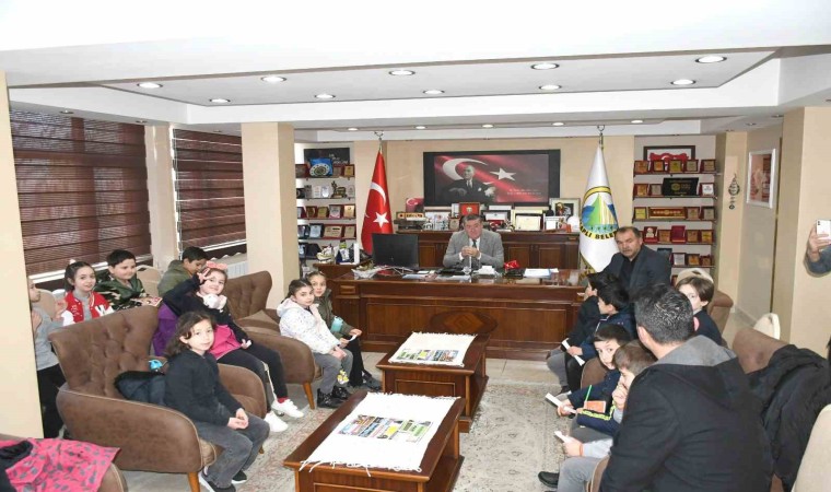 Minik öğrenciler hazırladıkları soruları Başkan Tekin’e yöneltirken, Tekin öğrencilere çeşitli hediyeler takdim ederek hatıra fotoğrafı çektirdi.