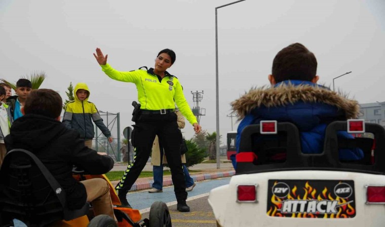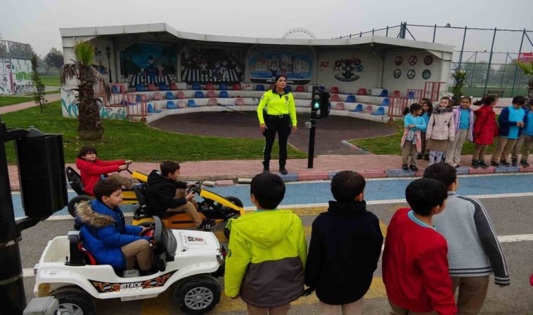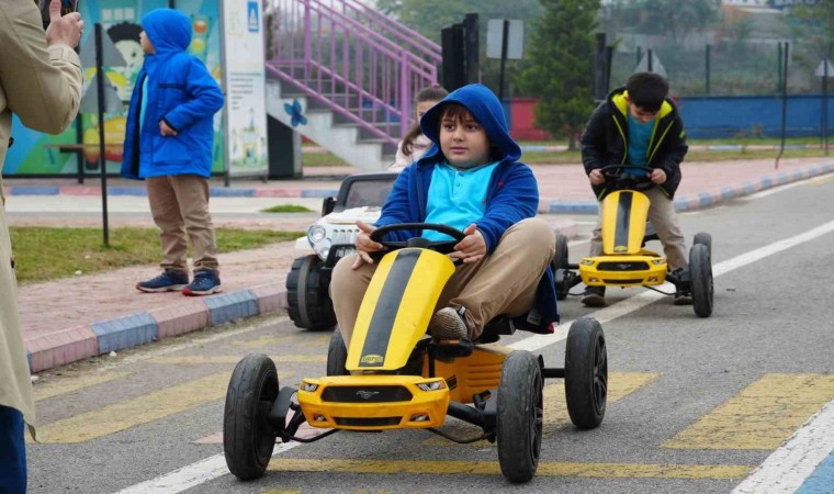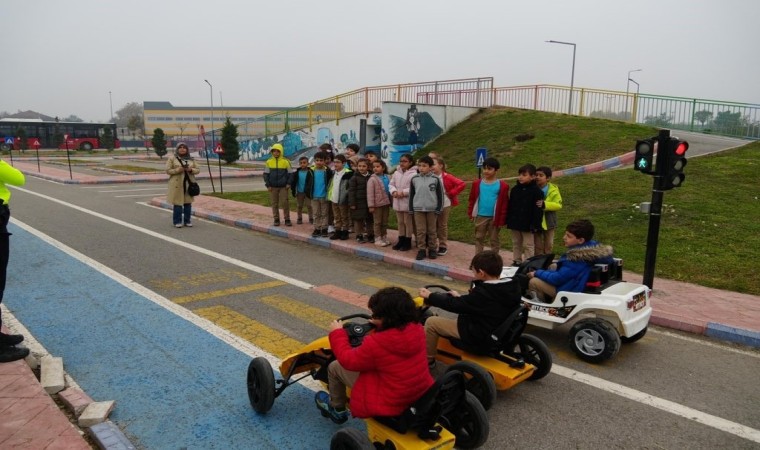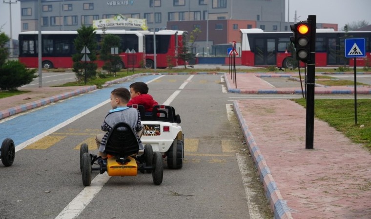 DÜZCE (İHA) – Düzce’de ilkokul öğrencilerine trafik eğitimi eğlenceli bir şekilde anlatılıyor. Çocuklar küçük arabalara binip kuralları öğreniyorlar.