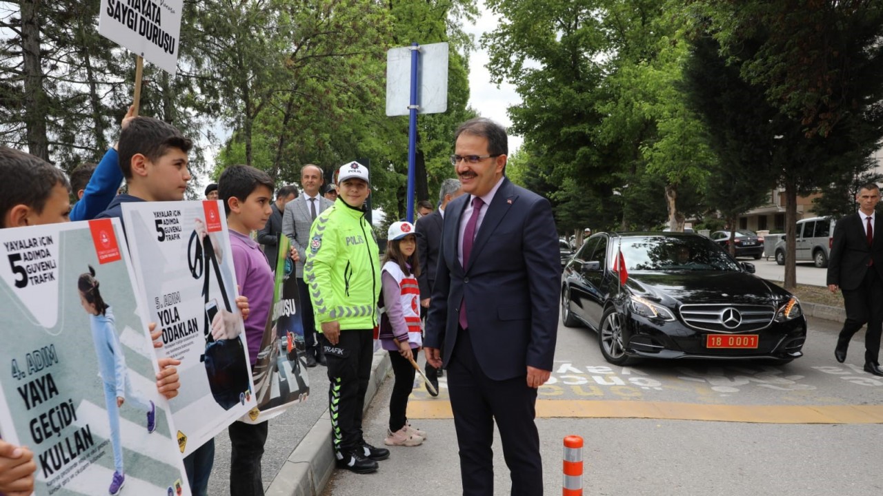 ÇANKIRI'DA YAYA GEÇİTLERİNDEKİ GEÇİŞ ÜSTÜNLÜĞÜNE DİKKAT ÇEKMEK AMACI İLE DÜZENLENEN DENETİMDE, ÖĞRENCİLER TRAFİK KURALLARINA DİKKAT ÇEKTİ. ETKİNLİĞE ÇANKIRI VALİSİ ABDULLAH AYAZ DA KATILDI