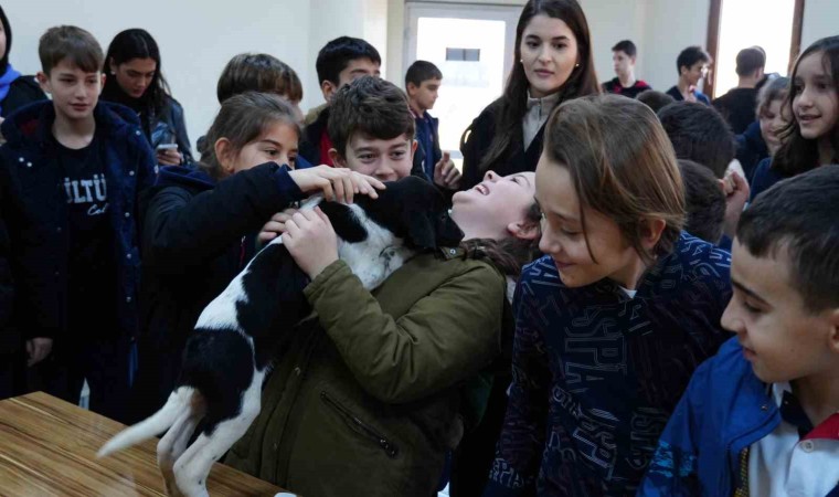Öğrenciler, köpeklerin gözetim altında tutulduğu kafesler ile sosyal ve serbest yaşam alanlarını gezerek patili dostlarla yakın temas kurdu, onları mama vererek beslediler.
