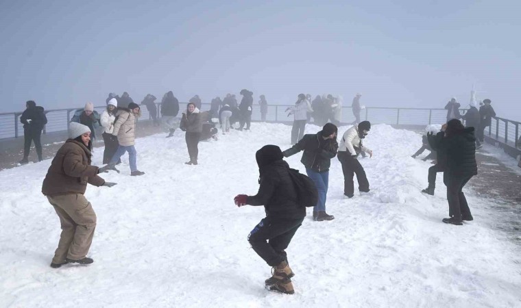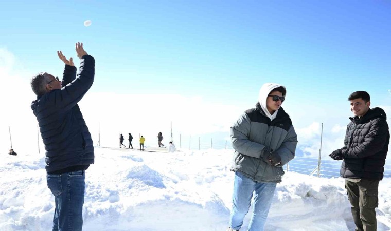 Başkan Topaloğlu, öğrencileri zirvede karşıladı. Zirvede karla karşılaşan öğrenciler soğuk havaya rağmen gönüllerince eğlendi ve Kemer manzarasını izledi.