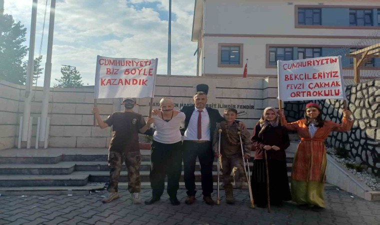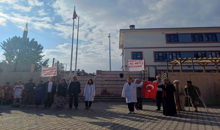 Konuşmanın ardından Sosyal Bilgiler öğretmeni Fatih Erik koordinesinde hazırlanan gösterilere geçildi. Atatürk Çocukları Korosu ve bayrak gösterisi yapan öğrenciler, zeybek oynadı. Öğrencilerin “Cumhuriyeti biz böyle kurduk” orotoryosu büyük alkış alırken, öğrenciler tarafından Çanakkale Savaşı’na damga vuran Seyit Onbaşı, Kurtuluş Savaşı’nda kundaktaki bebeğiyle Türk ordusuna cephane taşıyan Şerife Bacı, Rus işgaline karşı direnişin simgesi olan Nene Hatun canlandırıldı.