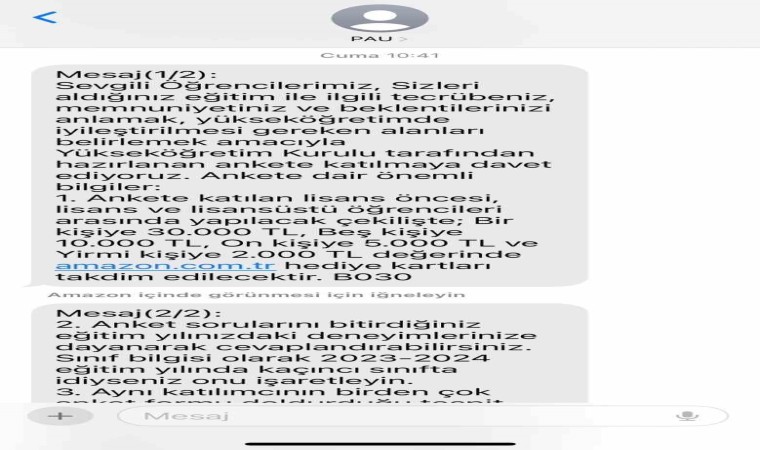 Öğrencilerin cep telefonlarına gönderildiği öğrenilen mesajda, “Sevgili öğrencilerimiz, sizleri aldığınız eğitim ile ilgili tecrübeniz, memnuniyetiniz ve beklentilerinizi anlamak, yükseköğretimde iyileştirilmesi gereken alanları belirlemek amacıyla Yükseköğretim Kurulu tarafından hazırlanan ankete katılmaya davet ediyoruz. Ankete katılan lisans öncesi, lisans ve lisansüstü öğrencileri arasında yapılacak çekilişte 1 kişiye 30 bin TL, 5 kişiye 10 bin TL, 10 kişiye 5 bin TL ve 20 kişiye 2 bin TL değerinde hediye kartları takdim edilecektir. Anket sorularını bitirdiniz eğitim yılınızdaki deneyimlerinize dayanarak cevaplandırabilirsiniz. Sınıf bilgisi olarak 2023-2024 eğitim yılında kaçıncı sınıfta idiyseniz onu işaretleyin. Aynı katılımcının birden çok anket formu doldurduğu tespit edilirse bu anketler çekiliş dışı bırakılacaktır” ifadeleri yer aldı.