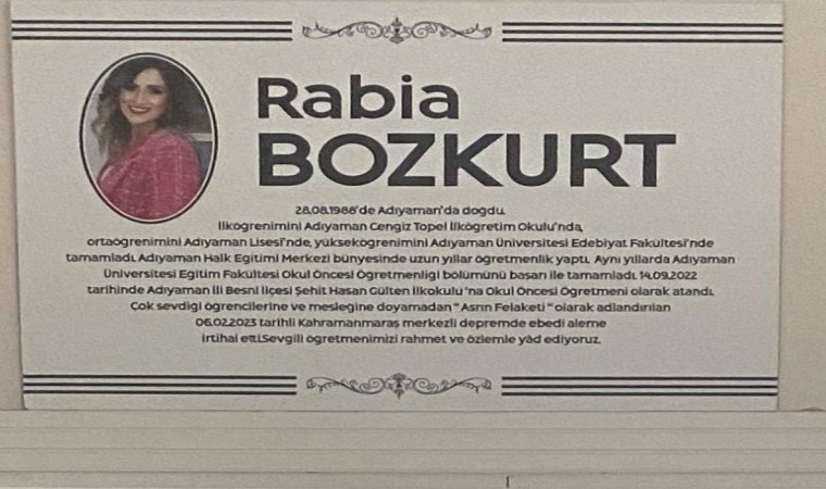 Uzun yıllar boyunca Adıyaman Halk Eğitim Merkezi’nde de öğretmenlik yapan ve daha sonra Besni Şehit Hasan Gülten İlkokuluna öğretmen olarak atanan Rabia Bozkurt, atandıktan 3 ay sonra meydana gelen 6 Şubat depreminde hayatını kaybetti. Öğrencileri ve meslektaşları tarafından oldukça sevilen Rabia Bozkurt’un ismi okulunda öğretmenlik yaptığı sınıfa verildi.