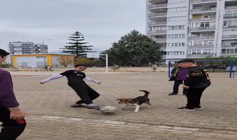 Adana’nın Kozan ilçesinde okul bahçesinde öğrencilerin futbol oyununa ortak olan köpek renkli görüntülere neden oldu.