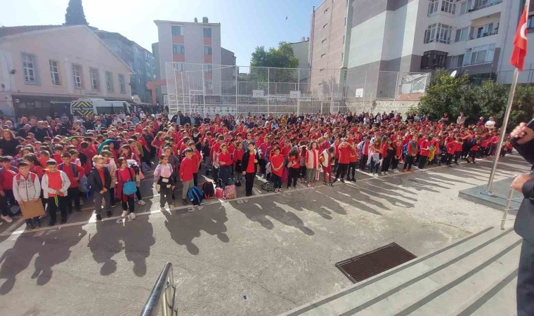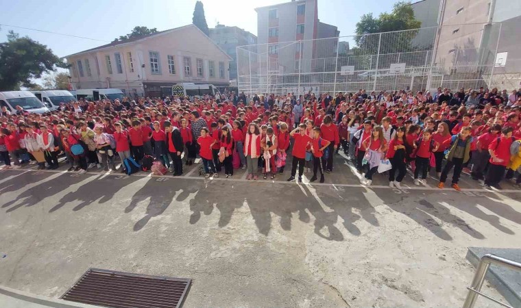 İsrail’in Gazze’ye saldırıları sebebiyle öğrenciler, Tekirdağ’da yarıya indirilen bayrağın önünde bir dakikalık saygı duruşunda bulundu.