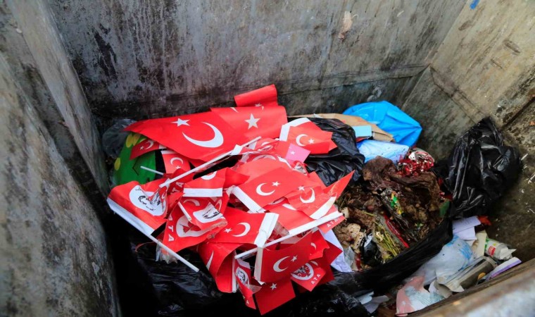 Çöpten bayrakları teker teker çıkardı