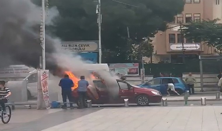 Manisa’nın Şehzadeler ilçesindeki okul önünde bir anda alev alıp yanmaya başlayan araç korkuya ve paniğe neden oldu.