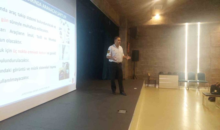 Tekirdağ İl Jandarma Komutanlığı Trafik Şube ekipleri tarafından 2024-2025 eğitim-öğretim yılı öncesinde Yahya Kemal Beyatlı Kültür Merkezi’nde yapılan toplantıya okul servis sürücüleri katıldı.
