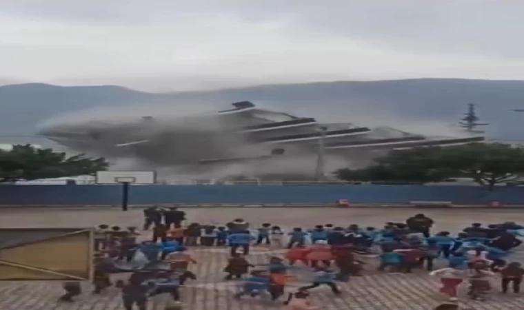 Okul yanında kontrollü yıkım; bahçedeki öğrenciler koşarak kaçtı