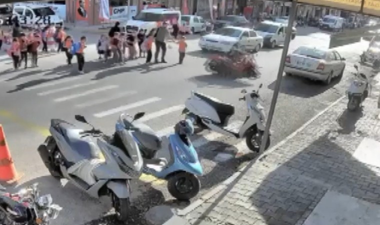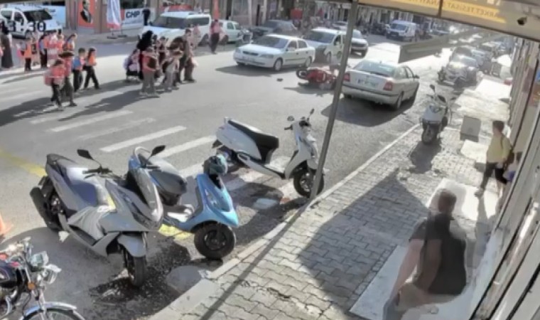 Öte yandan 3 çocuğun yaralanmasıyla sonuçlanan kaza anı ise çevredeki bir iş yerinin güvenlik kamerasına saniye saniye yansıdı. Görüntüde, okuldan çıktıktan sonra evine giden 3 çocuğa, yolun karşısına geçmek isterken motosiklet çarpma ve sonrasındaki panik anları yer aldı.