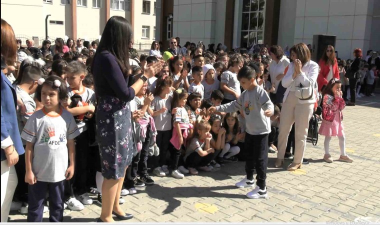 Kastamonu’da tatilin bitmesi ile okula dönen bir öğrenci, tören sırasında öğretmeniyle karşılıklı göbek atarak okulların açılışını kutladı.