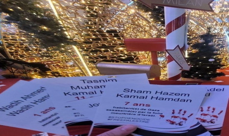 İsrail’in Gazze Şeridi’ne yönelik saldırıları dünya genelinde tepki çekmeye devam ediyor. Fransa’nın Lyon kentinde aktivistler, bir AVM’de İsrail’in saldırılarına karşı eylem yaptı. Eylemciler, İsrail’e destek veren markalara boykot çağrısı yapan broşürler ile İsrail’in saldırılarında katledilen küçük çocukların isimlerinin yazdığı broşürleri AVM’nin üst katından aşağı bıraktı. Etrafa uçuşan broşürlerde 1, 3, 7 ve 11 yaşlarındaki çocukların isimleri ile "soykırımı durdurun" ifadesinin yazılı olduğu görüldü.